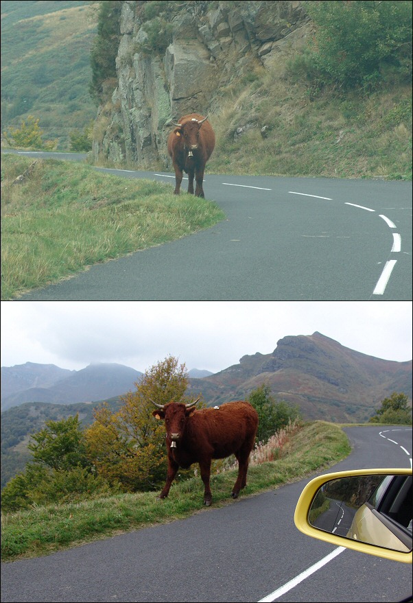 le 26 septembre 2005oui hein, en passant par Ydes-Bourg au lieu de Ydes-centre, j’en rencontre souvent… y-a la route qui traverse des champs, et souvent les barrières sont ouvertes pour laisser les vaches passer d’un prat à l’autre…
