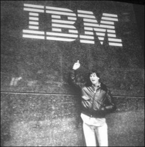 Vieille photo de Steve Jobs (PDG et co-fondateur d’Apple, exemplaire en matière d’innovation), le majeur levé devant les bureaux d’IBM qui pendant les années 80 a représenté l’immobilisme et l’arrogance face au développement du marché de la micro-informatique. Crédit : RedMonkey’s Film Division