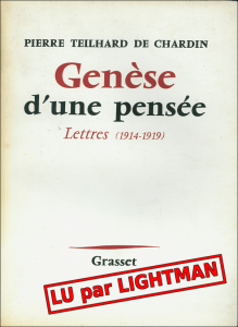 Je viens de terminer Genèse d’une pensée, de Pierre Teilhard de Chardin. Il s’agit d’un livre regroupant la correspondance entre ce célèbre père jésuite, scientifique, philosophe, théologien, et sa cousine écrivain Marguerite Teillard-Chambon. J’ai lu avec intérêt cette succession de lettres écrites entre 1914 et 1919, alors que le père Teilhard de Chardin était prêtre-soldat sur les champs de bataille de la première guerre mondiale.