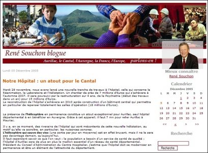 La blogosphère cantalienne s’agrandit à vue d’oeil ! Et cette fois-ci, c’est sa majesté le "roi René" qui arrive sur le net ! Qui l’eût cru ?! Eh oui, René Souchon, maire d’Aurillac vient d’ouvrir son blog (système Over-Blog, il a pas dû oser le Skyblog :-). Pas encore de commentaires, malgré l’info parue dans le piéton de La Montagne il y a quelques jours (comment ça "plus personne ne lit La Montagne" ? Mauvaises langues !!)…