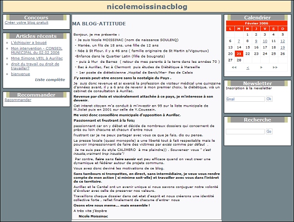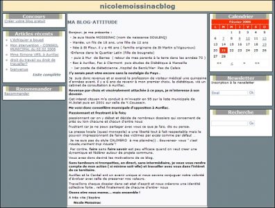 Bon, maintenant que le "roi René" est devenu empereur d’Auvergne, j’ai peur qu’il ne blogue plus beaucoup. Heureusement, Nicole Moissinac, conseillère municipale d’opposition à Aurillac vient d’ouvrir récemment son blog ! Voilà une bonne nouvelle pour la blogosphère cantalienne, d’autant plus que les commentaires ne sont pas modérés a priori !