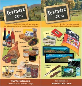 Au cours des semaines à venir et jusqu’à cet été, nous entamons une campagne pour faire connaître Testadaz, par le biais de prospectus (10×21 recto-verso, photo ci-contre). Ces prospectus, réalisés par Minimyr, on va essayer d’en distribuer partout où passent des gens susceptibles d’être intéressés par les produits cantaliens. Dans le Cantal auprès des touristes, qui chaque année doublent la population locale, mais aussi à l’extérieur du département.