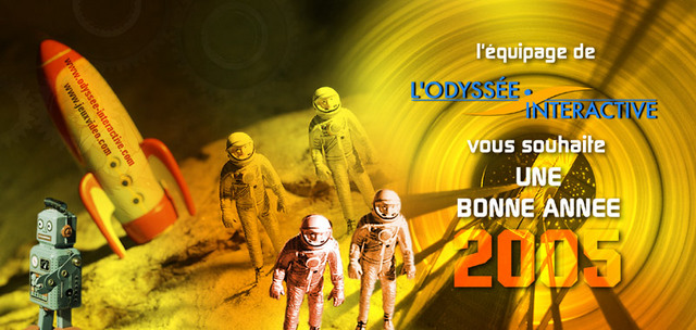 Oui, je sais j’ai du retard, mais j’attendais que José, l’un de nos deux artistes à L’Odyssée Interactive, termine la carte de voeux. C’est fait, et je peux donc vous souhaiter une excellente année 2005 ! Que votre santé soit en acier trempé, que votre vie personnelle soit délicieuse, et que vos paris professionnels les plus audacieux soient couronnés de succès !