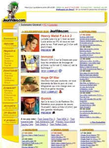 Je viens de parcourir sur le web un dossier rétrospectif qui montre le visage de quelques sites il y a 10 ans… Comme ils ont oublié jeuxvideo.com, je répare ici cet oubli en publiant une capture de jeuxvideo.com en août 2000, c’est à dire il y a près de 7 ans… Et oui le temps passé vite. J’ai obtenu cela grâce au célèbre site archive.org qui archive le web depuis plus d’une décennie… Je n’ai malheureusement pas de traces plus anciennes de jeuxvideo.com, archive.org ayant le défaut de ne pas garder les images (et nous les images de 1997, on les a effacées depuis belle lurette)… Si quelqu’un peut me dégoter une capture d’écran de la première version de jeuxvideo.com, je lui expédie 1kg de cantal via Testadaz ! Car il faut savoir que de février à septembre 1997 le site était bleu, avant d’adopter le jaune pendant 8 ans, pour repasser au bleu depuis…