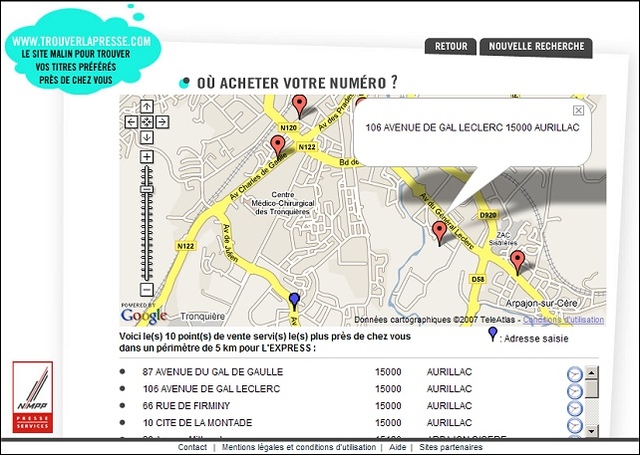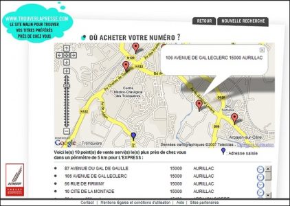 C’est le genre de questions qu’on est parfois amené à se poser. Eh bien le site TrouverLaPresse.com vous donne la réponse ! Vous saisissez votre rue, code postal, ville, ainsi que le titre que vous cherchez, et vous voyez apparaître une carte avec la localisation des 10 points de vente les plus proches de vous ! (voir capture ci-jointe). Pratique, hein ?