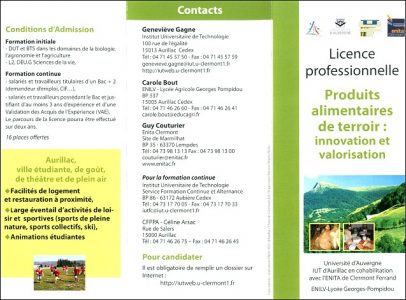 Petite pub pour une nouvelle formation bac+3 qui s’ouvrira en septembre sur Aurillac à l’ENILV : une licence professionnelle "produit alimentaire de terroir : innovation et valorisation". Voilà une bonne nouvelle ! J’aurai d’ailleurs le plaisir de me rendre à l’ENILV au cours de l’année scolaire prochaine, afin de présenter Testadaz.com au cours de deux heures de témoignage, dans le cadre de l’UE4 : "conduite et gestion de projet innovant".