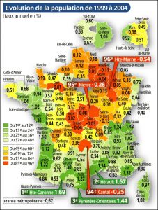 Petite remarque. Il semble que les départements ayant le plus fort taux de croissance soit les départements touristiques : facade atlantique au sud de la bretagne, zone pyrénéenne, cote méditéranéenne, corse et les alpes.
