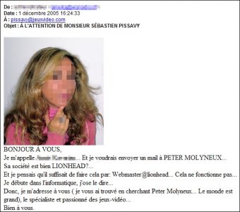Mais ce soir, encore mieux (décidément c’est une journée faste) ! Ce soir, c’est le coup de la midinette débutante en informatique qui trouve par hasard mon nom en cherchant à écrire à un grand créateur de jeux vidéo ! Je vous copier/colle ce mail-là, d’abord parce qu’il a le mérite de l’originalité, et puis parce qu’en plus il y a même la photo de la demoiselle ! (bon j’ai flouté au cas où 🙂 )…