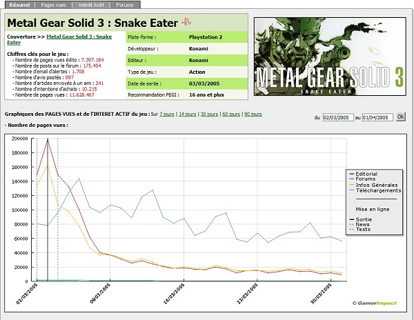 Il y a quelques semaines, L’Odyssée Interactive a lancé GamerImpact : outil statistique et marketing à destination des décideurs du secteur du jeu vidéo. Comment ça marche ? GamerImpact analyse les statistiques de connexion de JeuxVideo.com et en déduit des données marketing très intéressantes comme le jeu le plus attendu, celui qui recueille le plus grand nombre d’intentions d’achats, etc… Bref, des données inaccessibles jusqu’à présent sur le marché français, et qui sont très importantes pour le secteur afin de faire des prévisions et d’analyser le comportement des joueurs : avant et après le lancement d’un produit, après telle action marketing ou telle campagne de pub.
