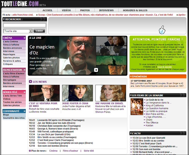 Et puis tout ce qu’on peut trouver de façon plus classique : les horaires et salles, toutes les stars passées présentes ou futures, tous les films, télé-films ou séries télé… Des news, des interviews en texte ou vidéo, etc, etc…